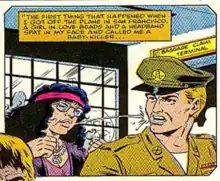 There is a persistent myth or misconception that many Vietnam veterans were spat on and vilified by antiwar protesters during the late 1960s and early 1970s. These stories, which overwhelmingly surfaced many years after the war, usually involve an antiwar female spitting on a veteran, often yelling "baby killer". Most occur in U.S. civilian airports, usually San Francisco International, as GIs returned from the war zone in their uniforms. Perhaps the most well known version of this caricature appeared in 1982 in the first Rambo movie, First Blood, where ex-Green Beret John Rambo, played by Sylvester Stallone, furiously complained about returning "to the world" and seeing "all those maggots at the airport. Protesting me. Spitting. Calling me baby killer".[1] It also appeared in an issue of Marvel Comics GI Joe series in January 1988.[2] But most often now it is used as a talking point by politicians and opinion makers when arguing for the importance of supporting U.S. troops, especially during war time. For example, during the Iraq War, Daniel Henninger, deputy editor of The Wall Street Journal editorial page wrote about the "horrifying" images of GIs being spat on as they returned from Vietnam.[3]