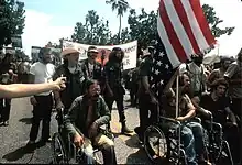 He also points out that during the Vietnam War years there were several newspaper accounts of pro-war demonstrators spitting on anti-war demonstrators and suggests that these oral accounts could easily have been reinterpreted and inverted and made into stories about activists spitting on veterans.[22] Perhaps one of the most well known of these spitting incidents was directed at antiwar activist and ex-Marine, Ron Kovic, who was wounded and paralyzed in the Vietnam War. At the 1972 Republican National Convention he and two other wounded vets shouted "Stop the bombing!" as Richard Nixon accepted the nomination for president, and were promptly spat on by a guy wearing a Four More Years button.[23]