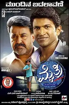Mythri (transl. Alliance) is a 2015 Indian social drama film written and directed by Giriraj and produced by N. S. Rajkumar under the banner of Omkar Movies.[1] It stars Mohanlal and Puneeth Rajkumar in extended cameo roles, and features Adithya Bharadwaj, Archana, Atul Kulkarni, and Bhavana in substantial roles.[2][3] Ilaiyaraaja scored the music for the film and Krishna Kumar handled the cinematography. The film is shot in both Kannada and Malayalam and the film is a social drama, and also focuses on relationships in the time of liberalisation.[4]