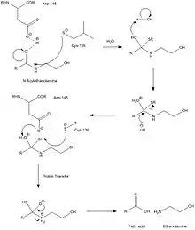 The overall enzyme mechanism involves cleavage into two chains, one of which contains the catalytic nucleophile, believed to be a cysteine residue. Unlike FAAH, which operates in basic conditions, this enzyme must operate under acidic conditions (pH ~4.5), and is completely inactivated at a pH of 8. Selective inhibitors of NAAA are ester and amide compounds, such as N-cyclohexanecarbonylpentadecylamine. NAAA is cleaved proteolytically at residue Cys-126. NAAA cleaves C-N non-peptide bonds in linear amides, particularly ethanolamides. Its mechanism is quite similar to that of AC, which is further supported by AC's ability to cleave N-acylethanolamines (NAEs), albeit at far lower rates and with different specificities. While mechanistic details are not very well known, catalytic activity of NAAA is thought to be activated by Cys-126 and Asp-145.