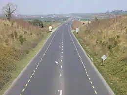 The route starts as motorway southwest of Newbridge (see thumbnail), and on the southwest side of Kilcullen. Prior to the 1993 opening of the Newbridge bypass, the N9 had run from Naas (east of the current M9). The previous route is now the R448.