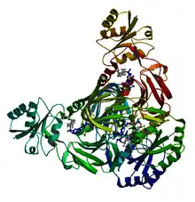 NAD+ kinase (EC 2.7.1.23, NADK) is an enzyme that converts nicotinamide adenine dinucleotide (NAD+) into NADP+ through phosphorylating the NAD+ coenzyme.[6] NADP+ is an essential coenzyme that is reduced to NADPH primarily by the pentose phosphate pathway to provide reducing power in biosynthetic processes such as fatty acid biosynthesis and nucleotide synthesis.[7] The structure of the NADK from the archaean Archaeoglobus fulgidus has been determined.[1]