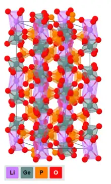 - ↑ Weiss, Manuel; Weber, Dominik A.; Senyshyn, Anatoliy; Janek, Jürgen; Zeier, Wolfgang G. (2018). "Correlating Transport and Structural Properties in Li 1+ x Al x Ge 2– x (PO 4 ) 3 (LAGP) Prepared from Aqueous Solution". ACS Applied Materials & Interfaces. 10 (13): 10935–10944. doi:10.1021/acsami.8b00842. ISSN 1944-8244. OSTI 1434719. PMID 29516733.
