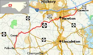 North Carolina Highway 10 (NC 10) is a primary state highway in the U.S. state of North Carolina. Originally established as the state's central highway, from Murphy to Beaufort, it now serves to connect the city of Newton with the nearby communities and towns in the foothills region.