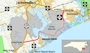 The entire routing of NC 172 is in Onslow County split in the middle by Camp Lejeune. The route's southern terminus is at US 17 in the unincorporated community of Folkstone, located between Holly Ridge and Wilmington. The road heads east-northeast through a mix of forest land and small houses towards the community of Sneads Ferry. About 4 miles (6.4 km) from its terminus, it intersects NC 210. It then starts to bend towards the north forming the border of the Sneads Ferry census-designated place. The Lakeside Drive/Old Ferry Road intersection is the last intersection that is accessible by the public along the southern segment of NC 172. North of there, the road crosses the New River before reaching the gate to Camp Lejeune. Through Camp Lejeune, the closed road heads east then north through mostly forested lands of the base. The road reopens at its intersection with Bear Creek Road, just north of a gate. On this segment of the road, NC 172 heads north passing forestland on the west side of the road and some houses on the east. The signed highway ends at a signalized intersection with NC 24 in Starling near Hubert.[1]