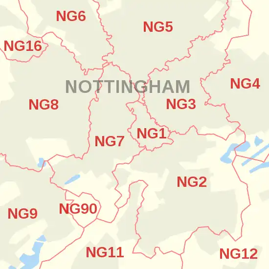 The NG postcode area, also known as the Nottingham postcode area,[2] is a group of 29 postcode districts in the East Midlands of England, within seven post towns. These cover central Nottinghamshire (including Nottingham, Mansfield, Sutton-in-Ashfield, Newark-on-Trent and Southwell), parts of south-west Lincolnshire (including Grantham and Sleaford) and small parts of Derbyshire and Leicestershire. The NG postcode area is one of six with a population above 1 million.[3]