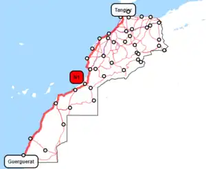 National Route 1 (N1) is a national highway of Morocco. It connects Guerguerat in the south near the border with Mauritania to Tangier on the northwest coast of Morocco.[1] It is an important highway running along the western Atlantic coast of the country. It passes through Rabat, Larache and other important cities and for a substantial part of the Rabat-Tangier leg runs parallel with the A1 Rabat–Tangier expressway. It is the longest national motorway in the country.