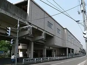 This station consists of two opposed elevated side platforms serving two tracks, with the station building located above underneath.