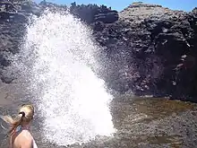 Nakalele Point is famous for a blowhole which produces powerful geyser-like water spouts with the waves and tides. Water spewed from the blowhole can rise as high as 100 feet in the air. Visitors to the site should never stand between the blowhole and the ocean, and visitors should never turn their backs on the ocean as rogue waves could cause injury at any time. Only one person is confirmed to have been sucked into the blowhole and died.[2]