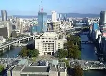 Nakanoshima (中之島) is a 3 km long and 50 hectares narrow sandbank in Kita-ku, Osaka city, Japan, that divides the Kyū-Yodo into the Tosabori and Dōjima rivers. Many governmental and commercial offices (including the city hall of Osaka), museums and other cultural facilities are located on Nakanoshima.