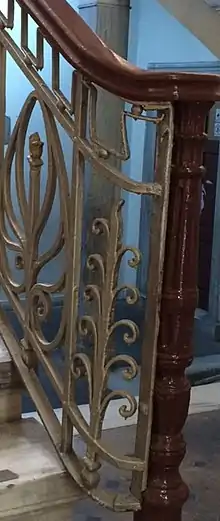 The repetition of plasters between rectangular windows make pattern on the facade. The entrance is defined by high platform and two Ionic columns. Inside, there are two Doric columns are following the two Ionic columns. Timber is used on the handrail. There are floral motives on the balustrades. The building has numerous marble ornamentations and a coffer ceiling. It has 2 terraces facing the garden.