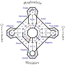 The aedificium has four towers at the four cardinal points, and the top floor of each has seven rooms on the outside, surrounding a central room. There are another eight rooms on the outer walls, and sixteen rooms in the centre of the maze. Thus, the library has a total of fifty-six rooms.[7] Each room has a scroll containing a verse from the Book of Revelation. The first letter of the verse is the letter corresponding to that room.[8] The letters of adjacent rooms, read together, give the name of a region (e.g. Hibernia in the West tower), and those rooms contain books from that region. The geographical regions are: