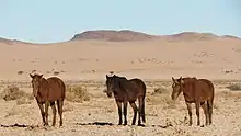 The Namib Desert horse (Afrikaans: Namib Woestyn Perd) is a feral horse found in the Namib Desert of Namibia. It is the only feral herd of horses residing in Africa, with a population ranging between 90 and 150. The Namib Desert horse is athletic in appearance, resembling the European light riding horses from which it probably descends, and usually dark in color. Despite the harsh environment in which they live, the horses are generally in good condition, except during times of extreme drought. The horses have been the subject of several population studies, which have given significant insight into their population dynamics and ability to survive in desert conditions.
