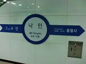 Nangmin Station (Korean: 낙민역; Hanja: 樂民驛) is an underground station of Busan Metro Line 4 in Nangmin-dong, Dongnae District, Busan, South Korea.