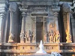 A granite wall surrounds the temple, enclosing all its shrines. The temple has a five-tiered rajagopuram, the gateway tower. The sanctum of the temple is believed to have been carved out in a single stone. The image of Nanjundeswarar in the form of Lingam is housed in the sanctum. It is made of granite and appears red in colour. The northern part of the temple houses the image of Ulaganayagi, the consort of Nanjundeswarar.[3] The vimana, the shrine over the sanctum of Nanjundeswarar is similar to the ones in North Indian temples, with a spiral structure. The metal image of Chandrasekara is unique that the full image of Ganga is sculpted unlike the other temples where Shiva is sported with crescent alone. The shrine also houses the images of Vinayaka, Subramanya, Veerabhadra, Rishabandika, Palani Andavar, Mahishasuramardini, Anjaneya and Nataraja on the walls. Shiva in one of the sculptures is portrayed as a hunter, while Parvathi as a dancer. The Vinayaka idol is sported with one of his legs bent, while image of Kali is sported with a dancing posture. There are sculptures depicting Machavallabha emerging out of fish, soldier armed with sword and a goat worshipping Shiva. There are also sculptures of live creatures like cow, goat, elephant, swan, fish, snake, yali, horse, pig, tiger and bull. Similar to the Meenakshi Amman temple, there are six 6 ft (1.8 m) elephants guarding the sanctum of Nanjundeswarar. There are miniature sculptures of Rishabaruda, Balasubramanya, Kali, Brahma and Lakshmi Narayana on both sides of the elephants.[1] The image of Subramanya is sported with twelve arms.[4]