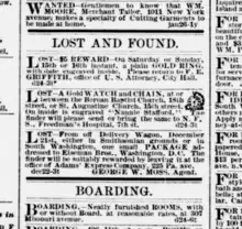 It appears that Stafford came back to Washington, D.C. in late December 1877, perhaps to visit old colleagues and friends from Howard University, who were the only people she is believed to have known in the area. However, during that time she lost a "gold watch and chain" which had "Nannie Stafford" engraved within. She advertised her lost watch multiple times in the Evening Star, mentioning that she lost it at or between Berean Baptist Church and St. Augustine. She asks whoever finds it to return it to "N.S.F. Freedman's Hospital" which today is Howard University Hospital.[18]