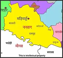 The Nandwaks/Nanwag Rajputs are a branch of the Suryavanshi kachhawaha Rajputs[1] in what is now the Indian state of Uttar Pradesh. In the 16th century, founder of nanwag dynasty shree Naun Rao ji and his descendants seized mariahun tahasil and ruled there for many years after.[2] The villages of Kathiraon, Newarhia (having fort of Nanwag chieftain, Zamindar Sangram Singh)[3] lying at 25" 31' N longitude and 82" 80' E latitude (tahsil Mariahu)[3] and Barsathi, latitude 25" 34' N and longitude 82" 91' E in Mariahu tehsil,[4] were administered by the Nanwag Rajputs from the 16th century to the later part of the 19th century.[5] The whole of Mariahu tehsil was administered by them during the medieval period and the tehsil got its name from Mandav Dev, the presiding deity of Nanwags.[6] currently they are spread in Prayagraj, Azamgarh, Mirzapur and Varanasi district. In census report of 1865,population of Nanwag rajput was approximate 24,000.