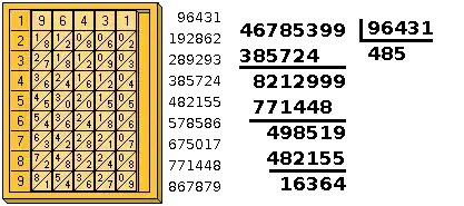 Division is performed in a similar fashion. To divide 46785399 by 96431, the bars for the divisor (96431) are placed on the board, as shown in the graphic below. Using the abacus, all the products of the divisor from 1 to 9 are found by reading the displayed numbers. Note that the dividend has eight digits, whereas the partial products (save for the first one) all have six. So the final two digits of 46785399, namely the '99', are temporarily ignored, leaving the number 467853. Then, the greatest partial product that is less than the truncated dividend is found. In this case, 385724. Two things must be marked down, as seen in the diagram: since 385724 is in the '4' row of the abacus, a '4' is marked down as the left-most digit of the quotient; the partial product, left-aligned, under the original dividend, is also written. The two terms are subtracted, which leaves 8212999. The same steps are repeated: the number is truncated to six digits, the partial product immediately less than the truncated number is chosen, the row number is written as the next digit of the quotient, and the partial product is subtracted from the difference found in the first repetition. The process is shown in the diagram. The cycle is repeated until the result of subtraction is less than the divisor. The number left is the remainder.
