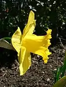 Narcissus plants have one to several basal leaf leaves which are linear, ligulate or strap-shaped (long and narrow), sometimes channelled adaxially to semiterete, and may (pedicellate) or may not (sessile) have a petiole stalk.[8] The leaves are flat and broad to cylindrical at the base and arise from the bulb.[9] The emerging plant generally has two leaves, but the mature plant usually three, rarely four, and they are covered with a cutin containing cuticle, giving them a waxy appearance. Leaf colour is light green to blue-green. In the mature plant, the leaves extend higher than the flower stem, but in some species, the leaves are low-hanging. The leaf base is encased in a colorless sheath. After flowering, the leaves turn yellow and die back once the seed pod (fruit) is ripe.[4]