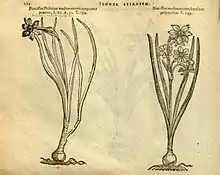 The genus Narcissus was well known to the ancient Greeks and Romans. In Greek literature Theophrastus[23] and Dioscorides[24] described νάρκισσος, probably referring to N. poeticus, although the exact species mentioned in classical literature cannot be accurately established. Pliny the Elder later introduced the Latin form narcissus.[25][26][27][28] These early writers were as much interested in the plant's possible medicinal properties as they were in its botanical features and their accounts remained influential until at least the Renaissance (see also Antiquity). Mediaeval and Renaissance writers include Albert Magnus and William Turner, but it remained to Linnaeus to formally describe and name Narcissus as a genus in his Species Plantarum (1753) at which time there were six known species.[1][29]