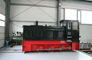 A twin-axled former pit locomotive from the Heeresfeldbahn fleet, built in 1944 at Klöckner-Humboldt-Deutz, which was stored after the war at Dahme. It was renovated in 1959 for use at RAW Dessau, the main change being a larger driver's cab. The axles were driven via a gear train and roller chains. In 1967 she was sold to Pretzien to the Ballerstedt Transport KG, where she hauled gravel trains until 1980.