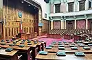 Interior design includes large and small halls and conference rooms, a central vestibule topped by a dome, polychrome walls with columns, pilasters, niches and loggias and a marble floor. The Assembly Hall, designed to hold 200 people, was expanded to accommodate 400.