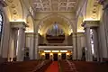 The large neoclassical church building was designed by John Russell Pope and completed in 1930.[12] The structure has a "monumental character" typical of Pope's style and seen in his other works, such as the Jefferson Memorial.[13] The church's design was partly influenced by James Gibbs' St Martin-in-the-Fields church, built at Trafalgar Square, London, in the early 18th century.[14] The building is built of Indiana limestone. Scholar Thomas A. Tweed writes that the building's facade, "high on a terrace overlooking Thomas Circle, a prominent location in the city ... demands the attention of motorists and pedestrians."[13]