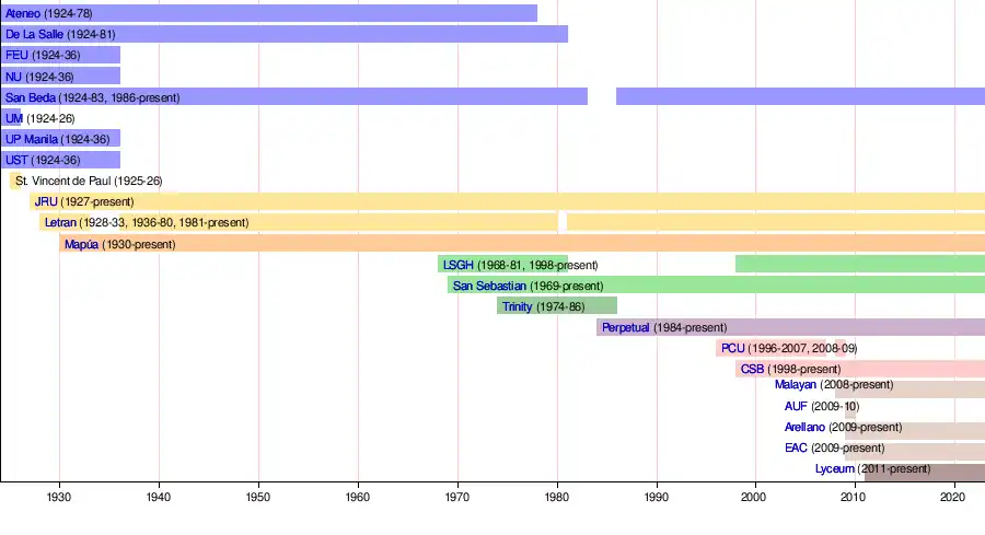 - ↑ "Timeline: UAAP history". Inquirer. August 31, 2019. Archived from the original on September 1, 2019. Retrieved April 30, 2021.