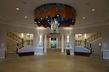 The Museum's interior is designed to provide a clear circulation path for visitors and creates central spaces for after-hours functions. In addition to administrative offices, the building also includes three gallery areas, a multipurpose theater, hands-on children's areas, a flexible exhibit space, research library, catering area, and a retail store. A 45–foot-high domed rotunda serves as an orienting point and houses the Hall of Fame honoree exhibits. Two grand staircases providing overlooks into the rotunda are made of different metal finishes and colors with art deco inspired ornamental railings. The floors are a honed Corton Bressandes French limestone on the ground floor. Doors of stained walnut mark the entrance to the theater. Western themes are found throughout including native flowers, horse heads and the wild rose motif. The current interior was designed by Projectiles architects.