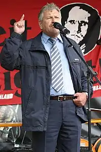 As a neo-Nazi organization[7][8] it has been referred to as "the most significant neo-Nazi party to emerge after 1945".[13] The German Federal Agency for Civic Education, or BPB, has criticized the NPD for working with members of organizations which were later found unconstitutional by the federal courts and disbanded,[14][15] while the Federal Office for the Protection of the Constitution (BfV), Germany's domestic security agency, classifies The Homeland as a "threat to the constitutional order" because of its platform and ideology, and it is under their observation.[16] An effort to outlaw the party failed in 2003, because the government had many informers and agents in the party, some in high position, who had written part of the material used against them.[17] Since its founding in 1964, The Homeland has never managed to win enough votes on the federal level to cross Germany's 5% minimum threshold for representation in the Bundestag; it has succeeded in crossing the 5% threshold and gaining representation in state parliaments 11 times, including one-convocation entry to seven West German state parliaments between November 1966 and April 1968 and two-convocation electoral success in two East German states of Saxony and Mecklenburg-Vorpommern between 2004 and 2011.[18] Since 2016, The Homeland has not been represented in state parliaments. Udo Voigt led the NPD from 1996 to 2011.[16] He was succeeded by Holger Apfel,[19] who in turn was replaced by Udo Pastörs in December 2013. In November 2014, Pastörs was ousted and Frank Franz became the party's leader. Voigt was elected the party's first Member of the European Parliament in 2014. The party lost the seat in the 2019 European Parliament election. In June 2023, the party renamed itself to Die Heimat after a party vote.[20][21]