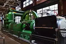 The Machinery Hall holds 21 artifacts loaned by the Smithsonian Institution which were previously on display at the National Museum of American History.[9] Items from the 1876 World's Fair in Philadelphia can be found on display in this exhibition.[10] The largest and most prominent artifact in this hall is the 115-ton, 8 MGD, International Steam Pump Company's Snow, Corliss Steam Engine that had pumped water for York, PA beginning in 1914.[4] In addition to the steam engine, the Machinery Hall also boasts a Milwaukee's Pawling & Harnischfeger Co. Crane and an H-beam from Bethlehem Steel.[10] Other artifacts displayed in this hall include original items used by workers such as punch cards, hard hats, whistles, welfare baskets, and safety reports.[9]