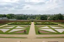 In the following centuries the mannerist garden arrangement was maintained. The symmetrical geometric parterres were enriched with rows of hornbeam with linden gazebos and dwarf fruit trees were planted (quince, cherries, apples).[19] There were also buildings: orangery, fighouse, two greenhouses, ice house and cold frames for the cultivation of seedling plants.[20]
