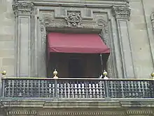 The facade is bordered on the north and south by two towers and includes three main doorways, each of which lead to a different part of the building.[1] The southern door leads to the Patio of Honor and presidential offices (no public access).[2] The northern door is known as the Mariana Door, named in honor of Mariano Arista who had it constructed in 1850. The area next to this door used to be the old Court Prison, with courtrooms and torture chambers. It is now occupied by the Finance Ministry. It contains the Treasury Room, constructed by architects Manuel Ortiz Monasterio and Vicente Mendiola. The iron and bronze door is the work of Augusto Petriccioli.[1]