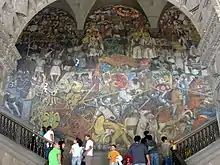 In the middle and largest panel, the Conquest is depicted with its ugliness, such as rape and torture, as well as priests defending the rights of the indigenous people. The battle for independence occupies the uppermost part of this panel in the arch. The American and French invasions are represented below this, as well as the Reform period and the Revolution. The left-hand panel is dedicated to early and mid-20th century, criticizing the status quo and depicting a Marxist kind of utopia, featuring the persons of Plutarco Elías Calles, John D. Rockefeller, Harry Sinclair, William Durant, J.P. Morgan, Cornelius Vanderbilt and Andrew Mellon as well as Karl Marx. This part of the mural also includes Frida Kahlo, Diego's wife.[1] This mural reflects Diego's own personal views about Mexico's history and the indigenous people of the country in particular.[3]