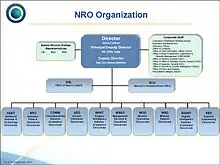 The NRO is part of the Department of Defense. The Director of the NRO is appointed by the President of the United States, by and with the consent of the Senate in accordance with Title 50 of U.S. code.[52] Traditionally, the position was given to either the Under Secretary of the Air Force or the Assistant Secretary of the Air Force for Space, but with the appointment of Donald Kerr as Director of the NRO in July 2005 the position is now independent. The Agency is organized as follows:[53]