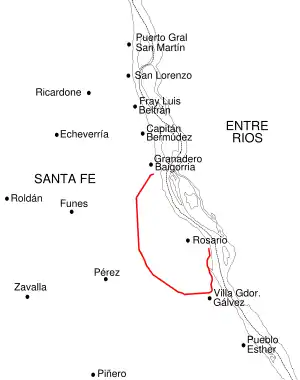 - the section from the east end on 27 Boulevard to the crossing of Ayacucho Street (old exit to the Rosario-Buenos Aires Road, now access to Provincial Route 21), is called "National Route A008 Tte. General Juan Carlos Sánchez" by decree #232 of 14 May 1981.