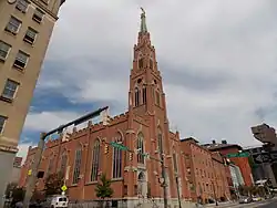 The Halle is a 4+1⁄2-story brick structure also in the Gothic Revival style opposite the church across Saratoga Street. It features a center entrance housed in projecting square bay topped by a gable. The adjacent three-story convent and the four-story rectory simple Georgian townhouses of brick. The complex was constructed between 1842 and 1845 and was the first major design by Baltimore architect Robert Cary Long Jr. From its founding until 1917, the parish was overseen by the Redemptorist Fathers whose members came to Baltimore to minister to the growing German immigrant community.[3] John Neumann was one of the early pastors of St. Alphonsus prior to becoming Bishop of Philadelphia in 1852. He was canonized on June 19, 1977.[4] Neumann's assistant pastor, Francis Xavier Seelos, served as pastor after his departure and later worked in areas from Connecticut to Illinois and New Orleans. Seelos was beatified on April 9, 2000.[5]