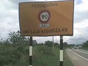Had Laju Kebangsaan (National Speed Limits) is a set of speed limits applicable on Malaysian expressways, federal roads, state roads and municipal roads. The National Speed Limits was enforced on 1 February 1989 following the National Speed Limit Orders 1989 (Perintah Had Laju Kebangsaan 1989).[1] Like any other countries in the world, failing to obey the speed limit on Malaysian roads and expressways is an offence as subject to Malaysian Road Safety Act 1987, which can be fined up to RM300, depending on the difference between the speed limit and the driven speed.
