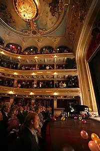 The golden period of the Belgrade Opera saw significant development and international affirmation of the Serbian operatic art. Starting in 1954 with a very successful performance of Boris Godunov by Modest Mussorgsky in Switzerland as a part of a concert cycle "Clubhouse", and gramophone recordings of seven major Russian operas for Decca. The Decca series was supported by Gerald Severn, an émigré White Russian. The venue found in the then Yugoslav capital for the first batch of recordings was the cinema in the Dom Kulture ("House of culture") complex, but which could only be used after the last film of the day (around 11 p.m.) so sessions took place at night.[9] Prince Igor and Khovanschina were recorded in February 1955, with Eugene Onegin, Life for the Tsar, Snow Maiden and Queen of Spades in September and October that year, all among the early Decca stereo records.[10] The company's recording of Boris Godunov took place in Zagreb between the other sets of sessions.[10]