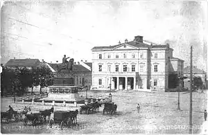 Though some preparatory works have begun, the prince didn't live to see the full blown construction. He was assassinated in Košutnjak on 10 June 1868 and the foundation stone was laid by his successor, prince Milan, on 31 August [O.S. 19 August] 1868. On that day the Metropolitanate of Belgrade Mihailo Jovanović consecrated the foundations.[3] A memorial charter was signed by the prince Milan and his regents and built into the foundations of the building. The charter had the following inscription: In the name of the Father, and of the Son, and of the Holy Spirit! This home, intended for the Serbian National Theater in Belgrade, first stage in Serbian capital city, is being built thanks to the will and significant money support from the Serbian prince Mihailo M. Obrenović III, who was assassinated by the villains in Topčider's Košutnjak on 29 May 1868. Foundation was laid by the Serbian prince Milan M. Obrenović IV, and consecrated and blessed in the church ceremony by the Archbishop of Belgrade and Metropolitan of all Serbia Mihailo, in the month of August, 19th day, 1868. The Lord shall count, when he writeth up the people, that this man was born there.[4] The building was roofed the next January and ceremonially opened on 12 November 1869.[3]