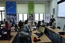 The American Library is named in memory of Victor Kytasty, who dedicated himself to the development and growth of the National University of Kyiv-Mohyla Academy.[7] It is a public library maintained as a department of the National University of Kyiv-Mohyla Academy Library. It was opened after the U.S. Embassy in Ukraine transferred the library from the America House to the campus of the Kyiv-Mohyla Academy in 1998.[8] The library offers readers up-to-date English-language resources, books for kids and adults, free Internet access, and fun events like Friday night film showings. Address: 8/5 Voloska str., building 4 room #116.[9][10]