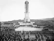 Work on the carillon was completed in time for an Anzac Day 1932 dedication viewed by a crowd of 10,000 people.[5] Various dignitaries gave speeches, Governor-General Lord Bledisloe switched on the Lamp of Remembrance on top of the tower, and then the carillon played the national anthem and several hymns, accompanied by the singing of the crowd.[5] The Evening Post described the sound of the carillon as 'magic from the skies'.[10]