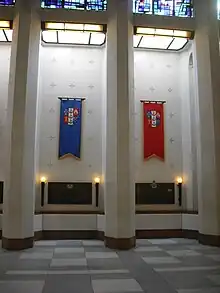 On each of the two side walls of the Sanctuary a large cross forms the background for the coats of arms of the main towns of the nine provinces of New Zealand. These crosses symbolise the sacrifices made by New Zealanders in times of war.[12]