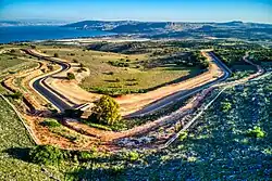 The advanced Eshkol Water Filtration Plant, completed in 2007-2008 by Mekorot,[8] the fourth largest in the world,[9] is located at the southwestern edge of the Beit Netofa Valley. The water first passes through two large reservoirs. The first of these is a sedimentation pond, holding about 1.5 million m³ of water, which allow suspended matter in the water to settle to the bottom, thus cleaning the water. The second reservoir is separated from the sedimentation pond by a dam and has a capacity of 4.5 million m³. Here the inflow of water from the pumping stations and open canals is regulated against the outflow into the closed pipeline. The amount allowed through depends on water demand. A special canal bypasses the reservoirs allowing water to travel straight through the carrier.[1] Before entering the closed pipeline, final tests are performed on the water in the carrier, with chemicals added to bring the water to drinking standards. At the end of the filtration process the water enters the 108" Pipeline, which transports it 86 km to the Yarkon-Negev system near the city of Rosh HaAyin to the east of Tel Aviv and Petah Tikva.[1]