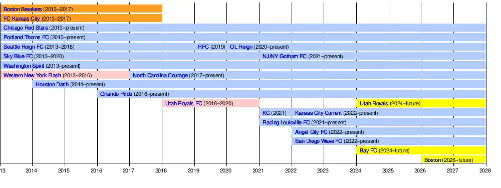 The NWSL was established in 2012 as the successor to Women's Professional Soccer (WPS; 2007–2012), which was itself the successor to Women's United Soccer Association (2001–2003). The league began play in 2013 with eight teams, four of which were former members of WPS (Boston Breakers, Chicago Red Stars, Sky Blue FC, and Western New York Flash).[3][4][5] As of 2022, it has 12 teams across the United States.[6][7]