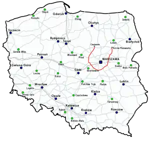 National road 50 (Polish: Droga krajowa nr 50) is a route belonging to the Polish national road network. The highway forms a part of bypass of Warsaw metropolitan area, running from 29 to 84 km away from centre of Warsaw. The route has two bridges over Vistula, one in Wyszogród and another in Góra Kalwaria.