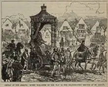 In the Middle Ages, services of this kind were held in one of the Chapels Royal and were attended only by the members of the royal court, while members of the House of Lords simultaneously went to Westminster Abbey and the House of Commons, to St Margaret's, Westminster, for their respective thanksgiving services.[1] However, in 1588, Queen Elizabeth I marked the defeat of the Spanish Armada by processing in a Roman-style chariot from Somerset House to Old St Paul's for a service of public thanksgiving. On her route, the queen entered the City of London at Temple Bar, where she was met by the Lord Mayor and Aldermen, and was offered the sword of the City as a sign of fealty, a tradition which has been maintained to the present.[2] During the service, the queen was seated in a royal box in the north aisle, from where she could hear the sermon which was preached just outside at St Paul's Cross to a huge crowd.[3]
