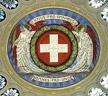 [7] Traditional and widespread, but not yet official. It has been recognized and used by various Swiss presidents. German: Einer für alle, alle für einen; French: Un pour tous, tous pour un; Italian: Uno per tutti, tutti per uno; Romansh: In per tuts, tuts per in. |
