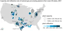 In 2012, the United States produced 25.3 trillion cubic feet of marketed natural gas, with an average wellhead value of $2.66 per thousand cubic feet, for a total wellhead value of $67.3 billion.[2] In 2013, the country produced 30.0 trillion cubic feet (TCF) of marketed gas.[3] With 7,545 billion cubic feet (BCF), the leading gas-producing area in the United States in 2013 was Texas, followed by Pennsylvania (3,259 BCF), and Louisiana (2,407 BCF).[4] US natural gas production achieved new record highs for each year from 2011 through 2015. Marketed natural gas production in 2015 was 28.8 trillion cubic feet, a 5.4 percent increase over 2014, and a 52 percent increase over the production of 18.9 trillion cubic feet in 2005.[5] The natural gas industry includes exploration for, production, processing, transportation, storage, and marketing of natural gas and natural gas liquids.[6] The exploration for and production of natural gas and petroleum form a single industry, and many wells produce both oil and gas.