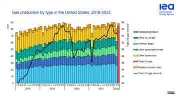 Since 2000, shale gas has become a key source of natural gas in the US. Production rose more than tenfold from 2007 to 2018, when shale gas contributed 23.6 TCF, 63 percent of US gas production, and was still increasing.[11]